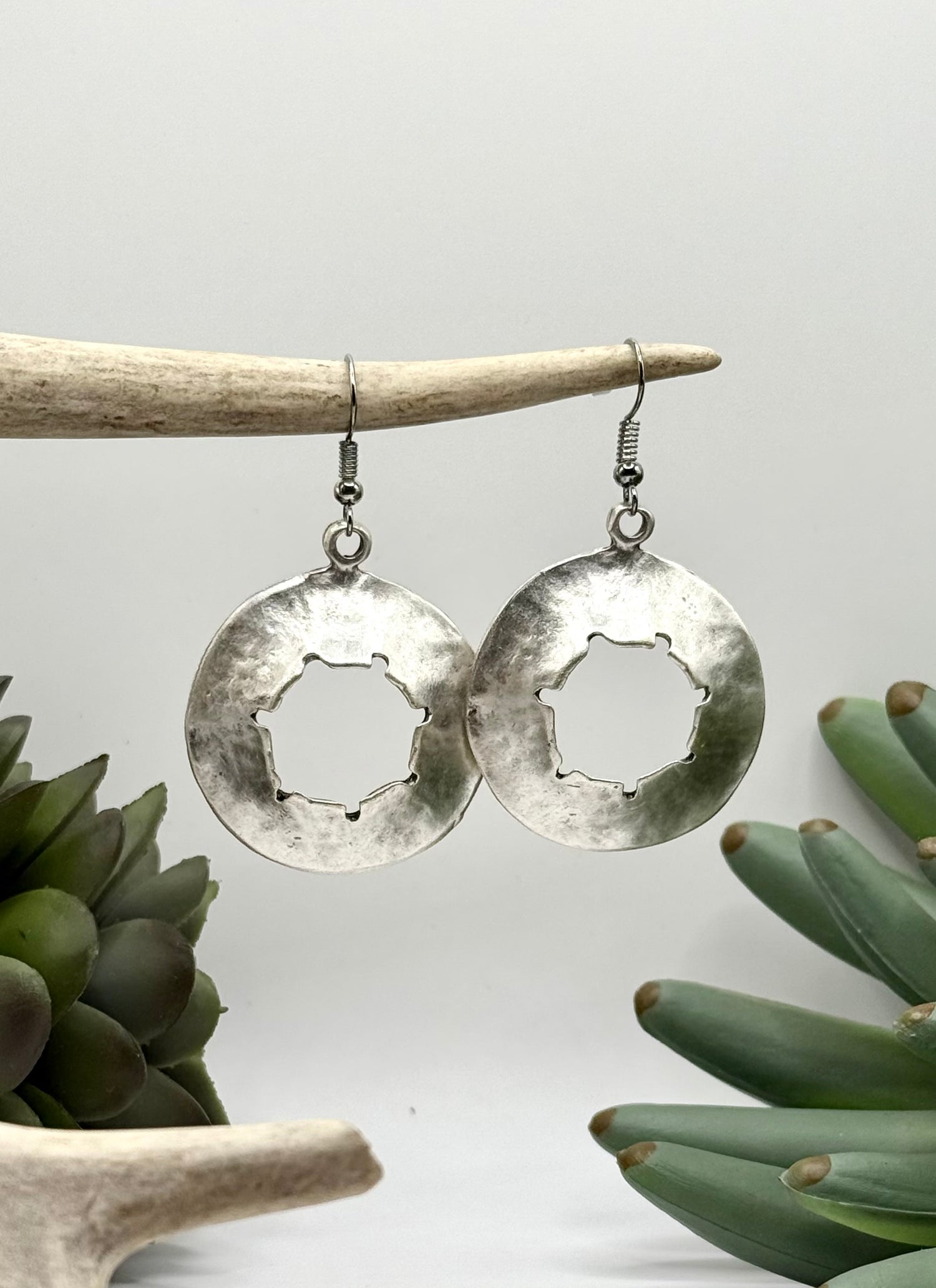 Add some modern flair to your jewelry collection with these Hoop Earrings. Uniquely crafted these matte silver earrings feature a distinctive breakthrough design, adding a touch of sophistication to any outfit. 1.5” round, 2.25” drop