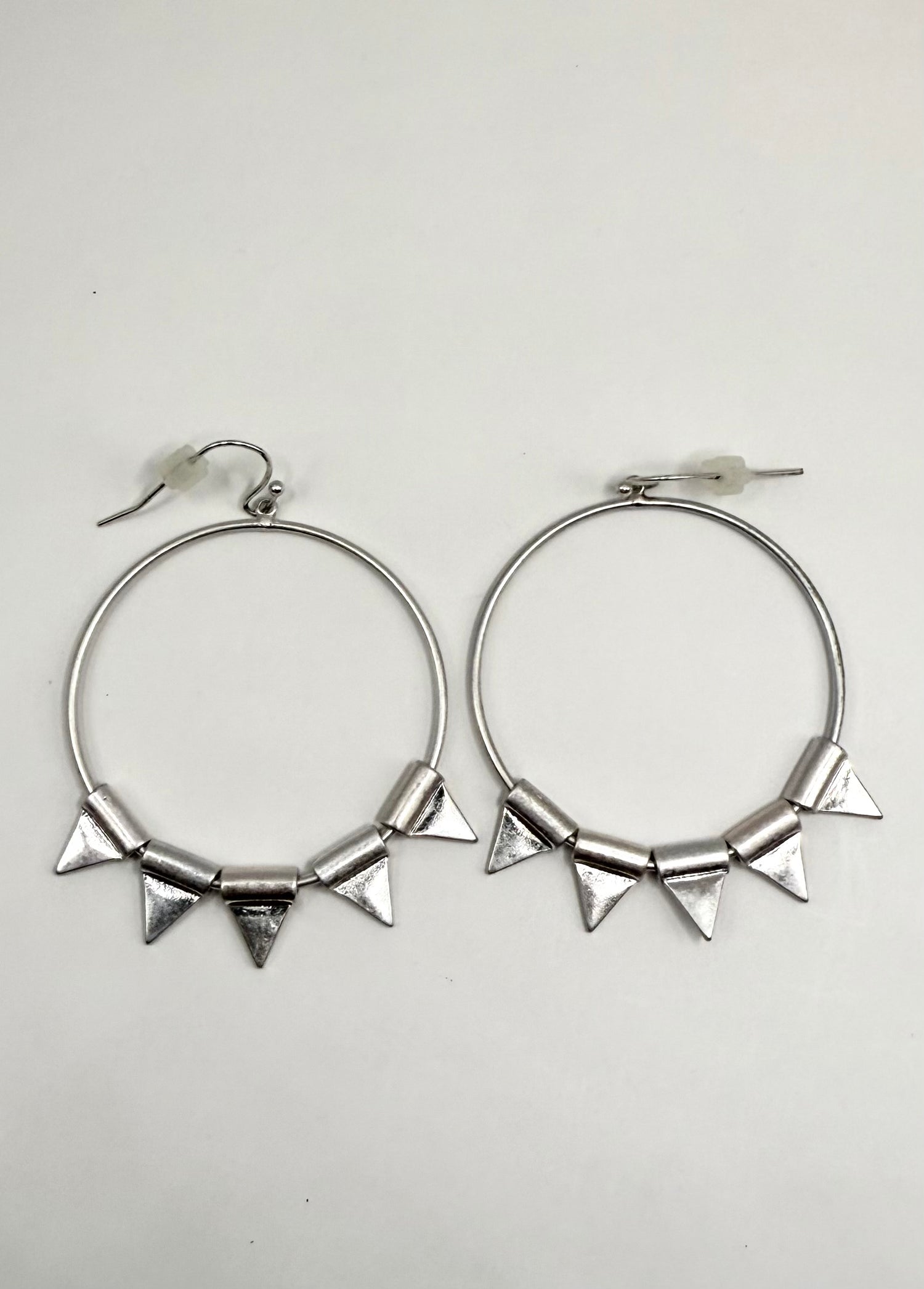 These hoop earrings are made of silver and have an edgy spike design. They have a diameter of 1.5 inches and a length of 2 inches.