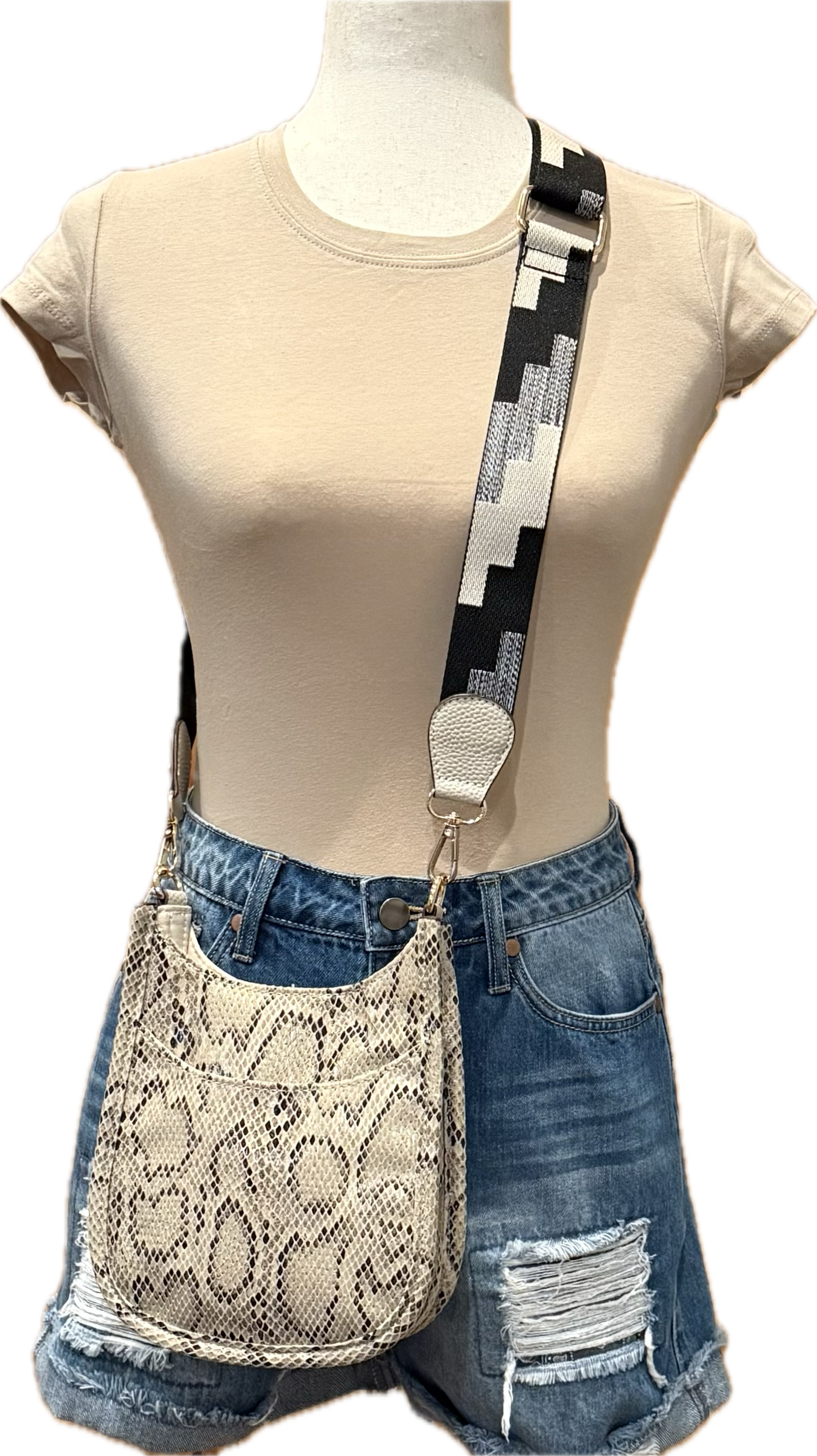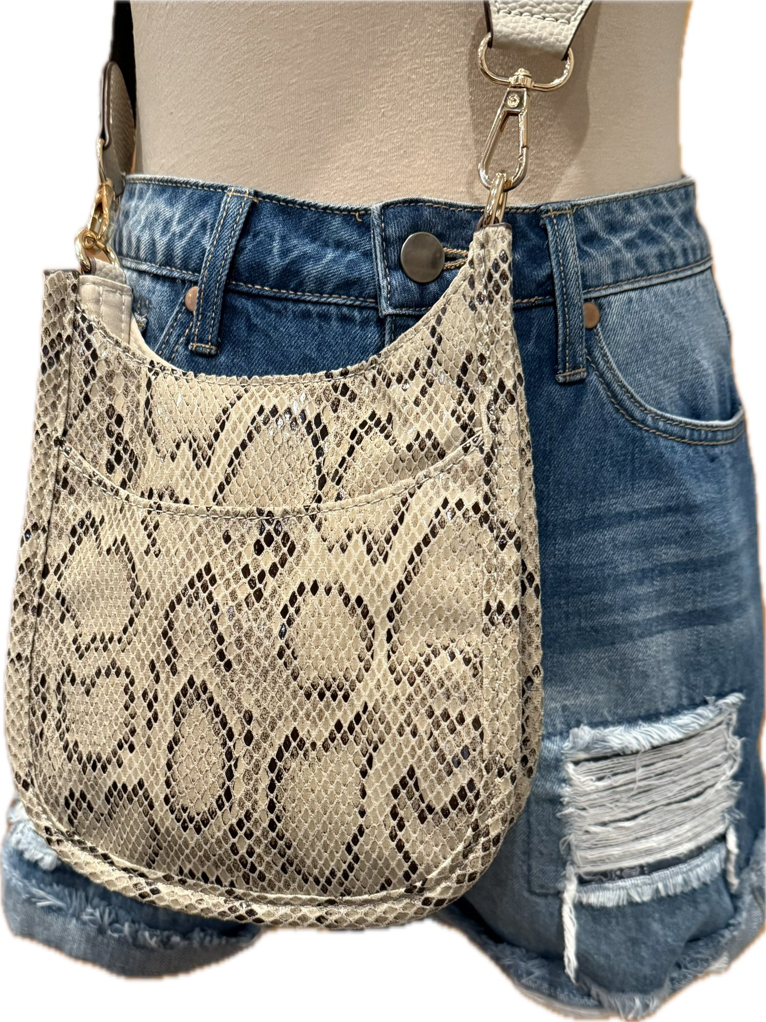 This Faux Leather Snake Print Bag is crafted from soft faux leather, offering durability and a stylish design. Measuring 7.5” x 8” x 2.5”, it includes an adjustable 1.5” wide strap and a side pocket for convenience. The interior features two pockets, including a secure zipper pocket, enhancing organization.