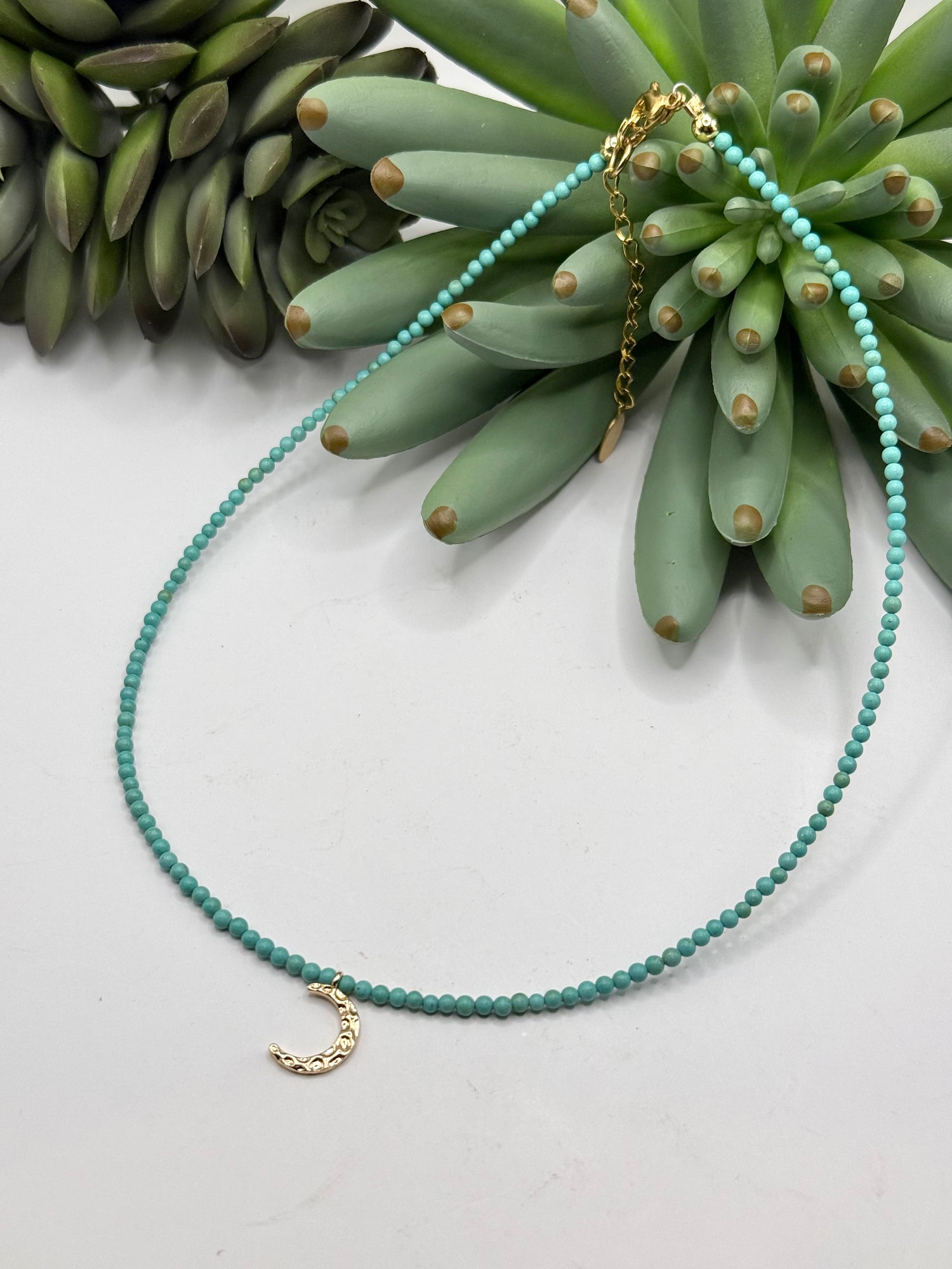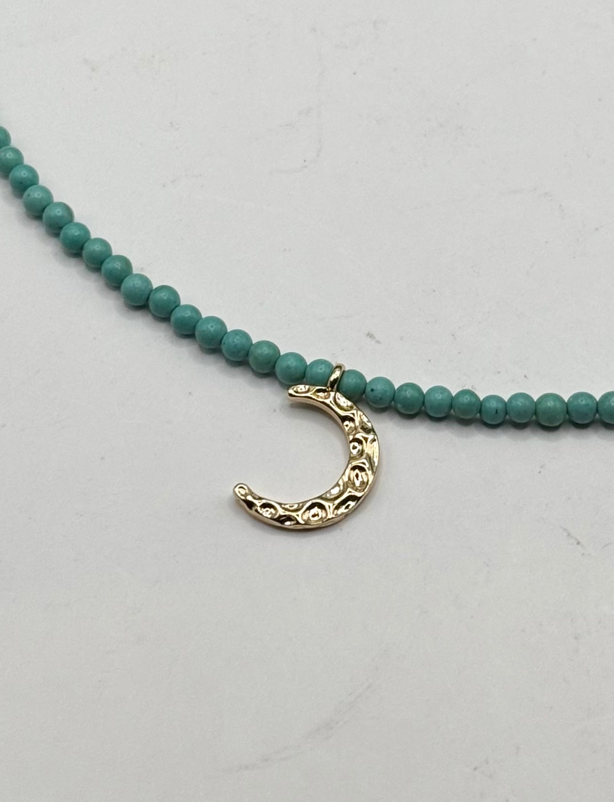 The Gold Crescent Moon Necklace features a delicate turquoise seed bead design and a small, textured gold crescent moon charm. Its adjustable length of 16” to 17.5” allows for a perfect fit, making it a charming accessory for any outfit.