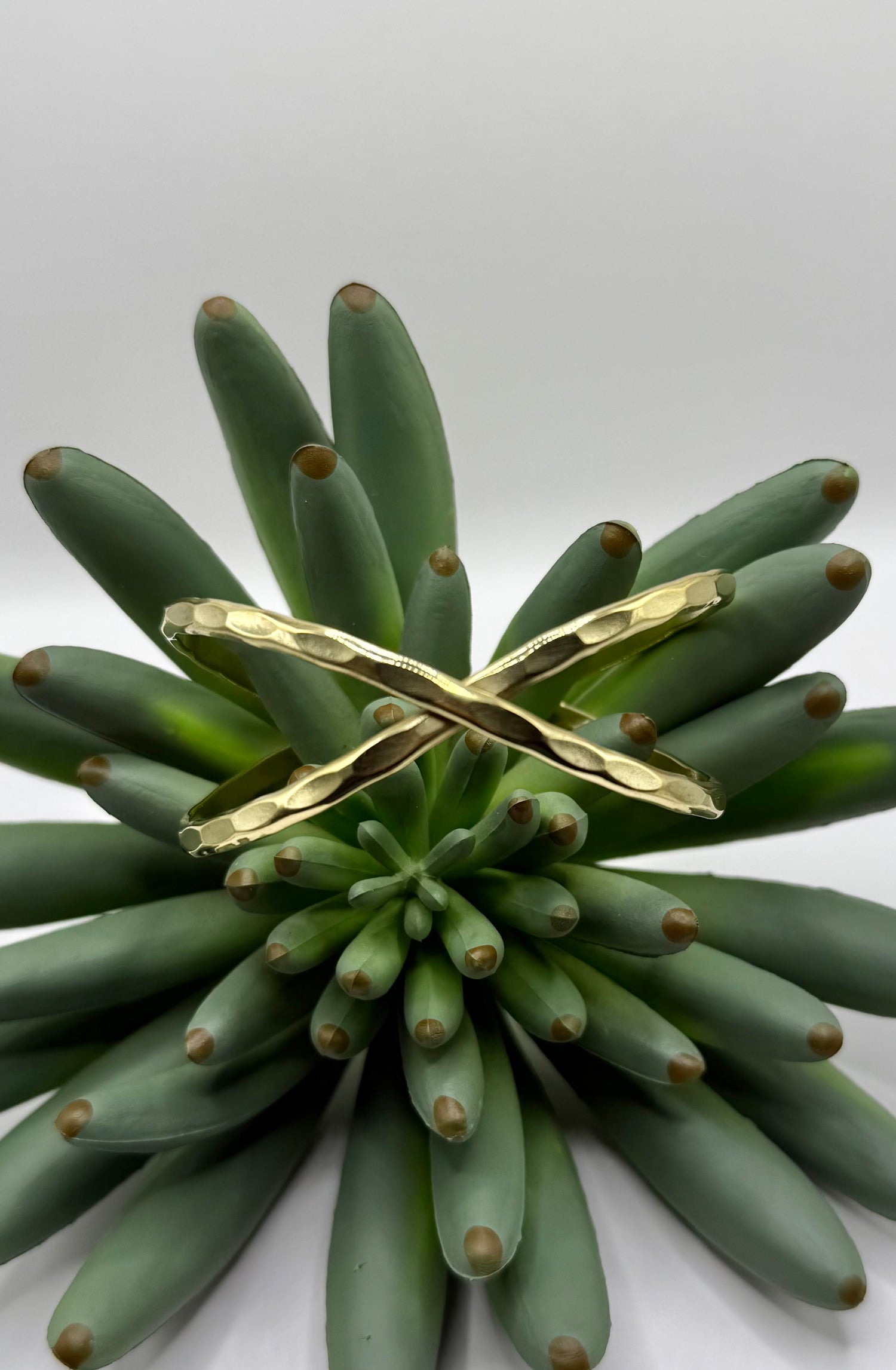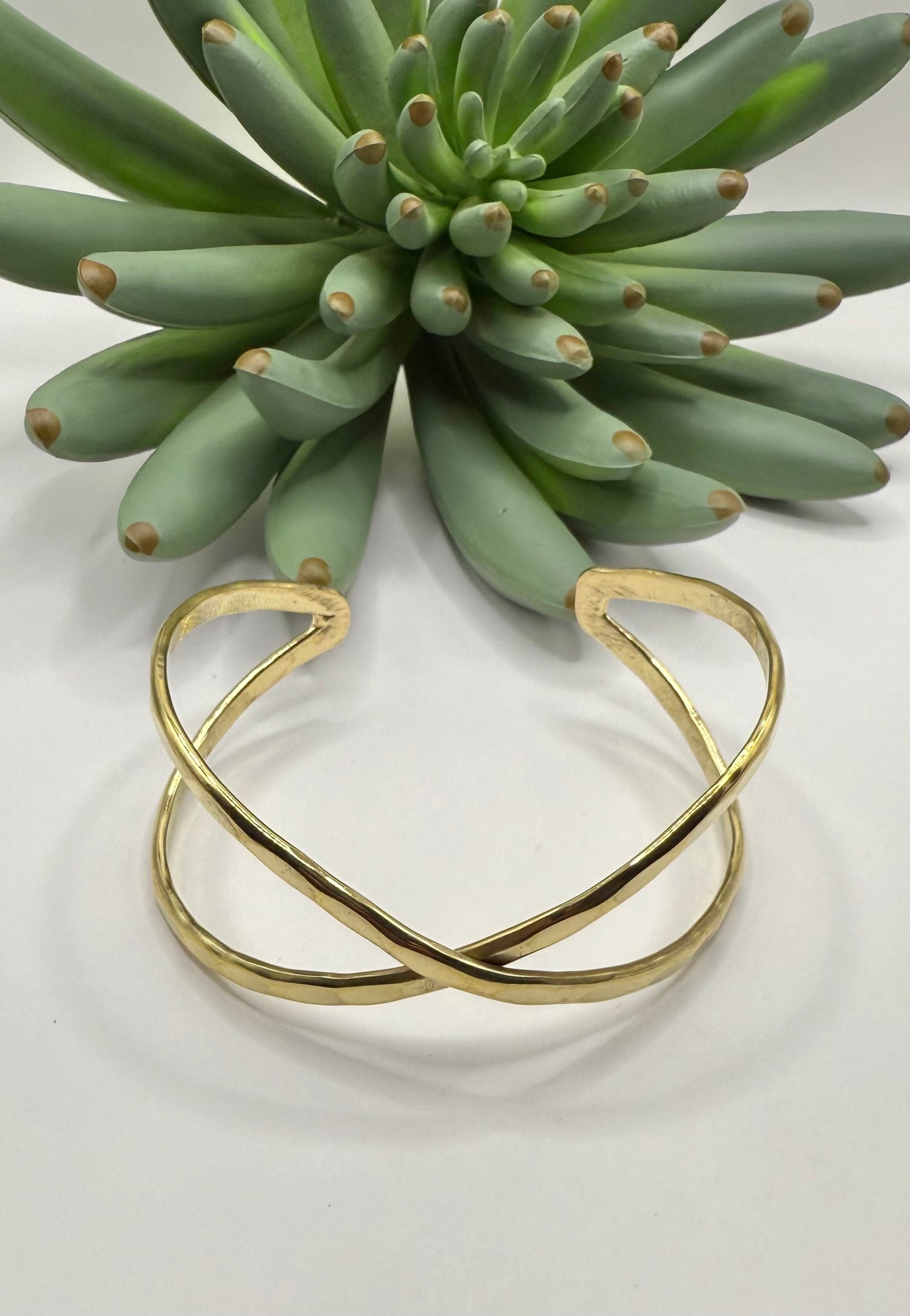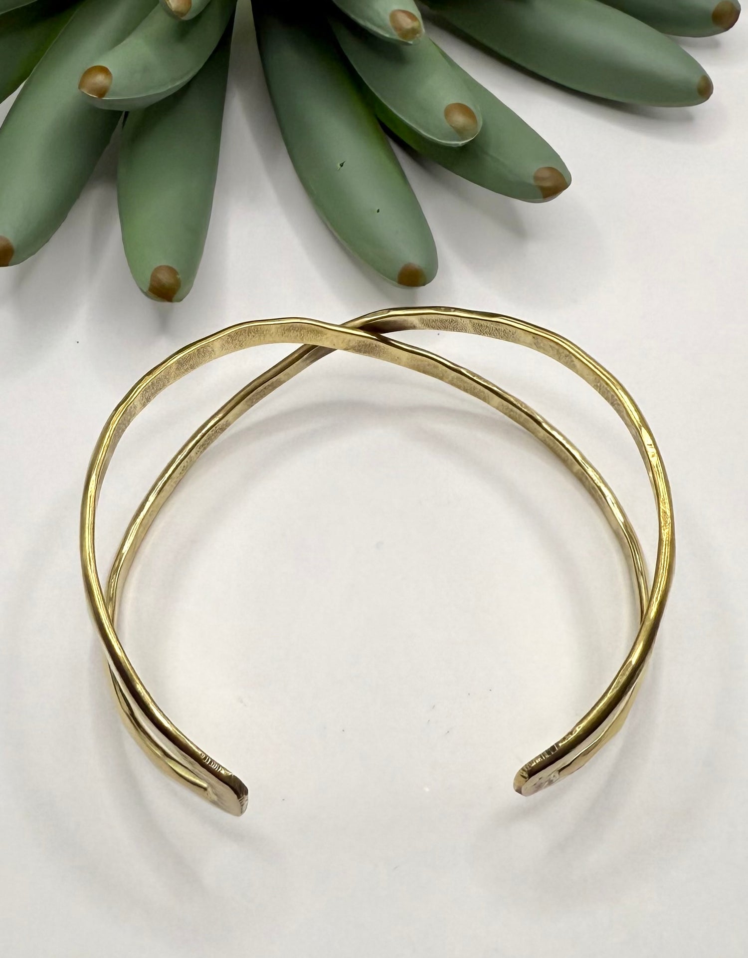 Gold hammered cuff in overlapping crisscross design. Easy fashion for everyday wear. This versatile piece enhances any outfit, providing a unique aesthetic that complements a range of styles while maintaining durability for daily use.