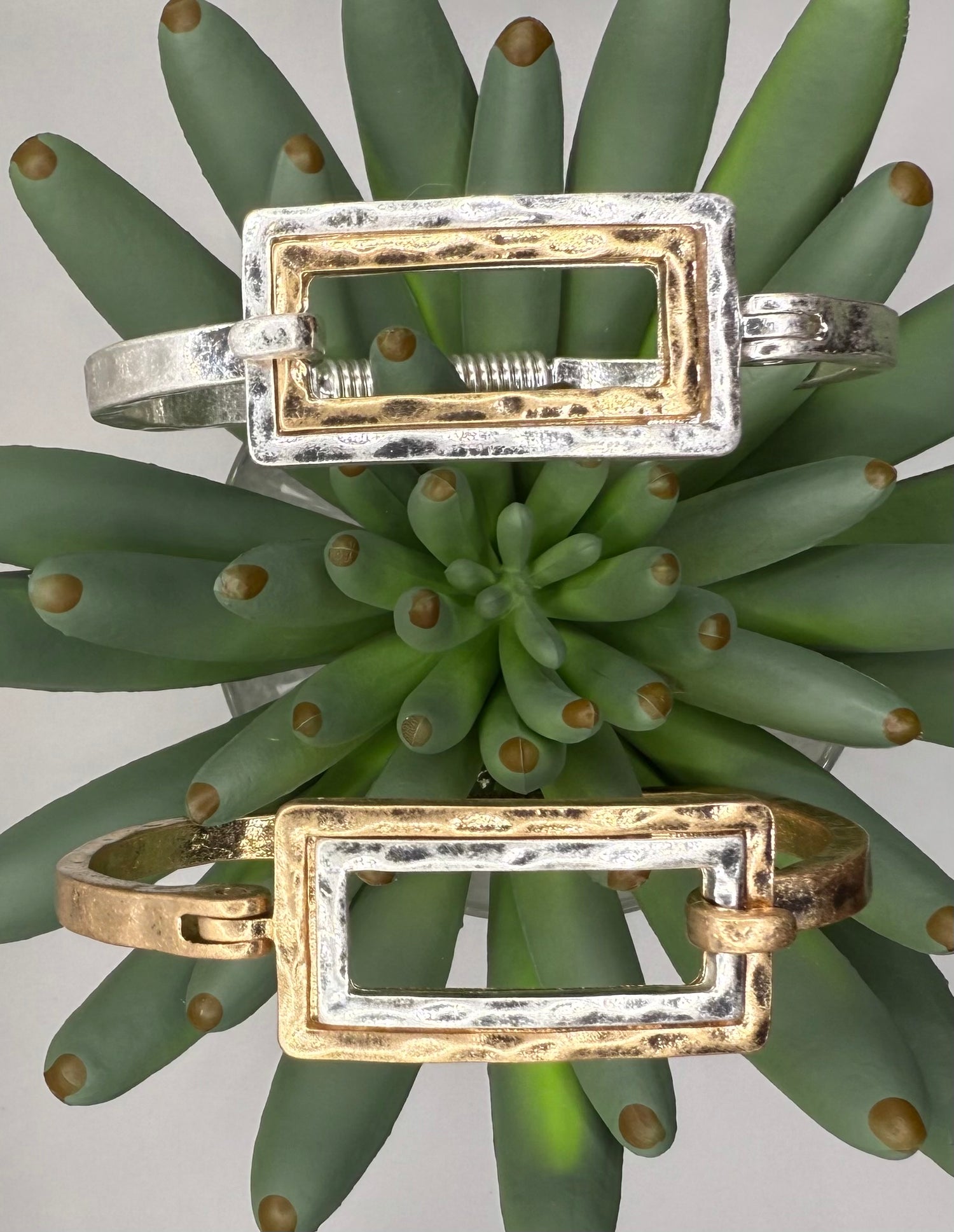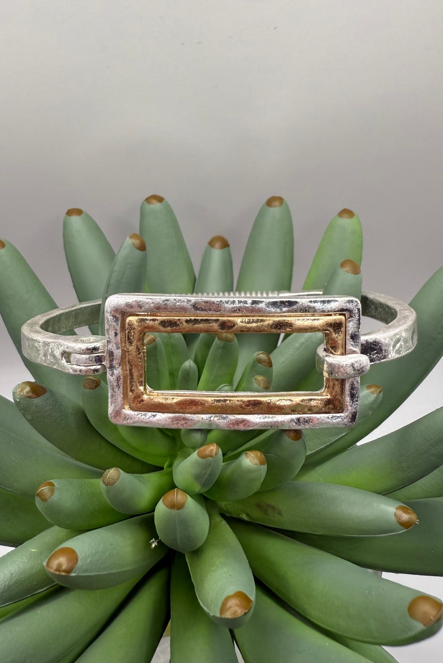 This mixed metal rectangle bracelet features a unique combination of silver and gold. The bracelet is designed with a spring loaded closure for easy and secure fastening.