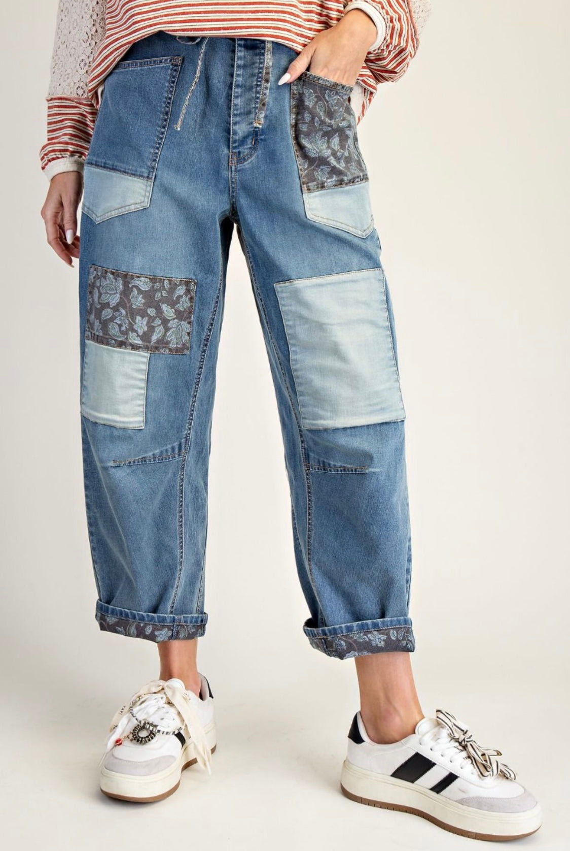 Designed with a relaxed fit, these denim pants feature a unique patchwork design with a floral pattern. The multiple large patch pockets provide convenience, while the drawstring and elasticized waistband offer a comfortable fit. With a cropped length, these pants are perfect for any casual look.