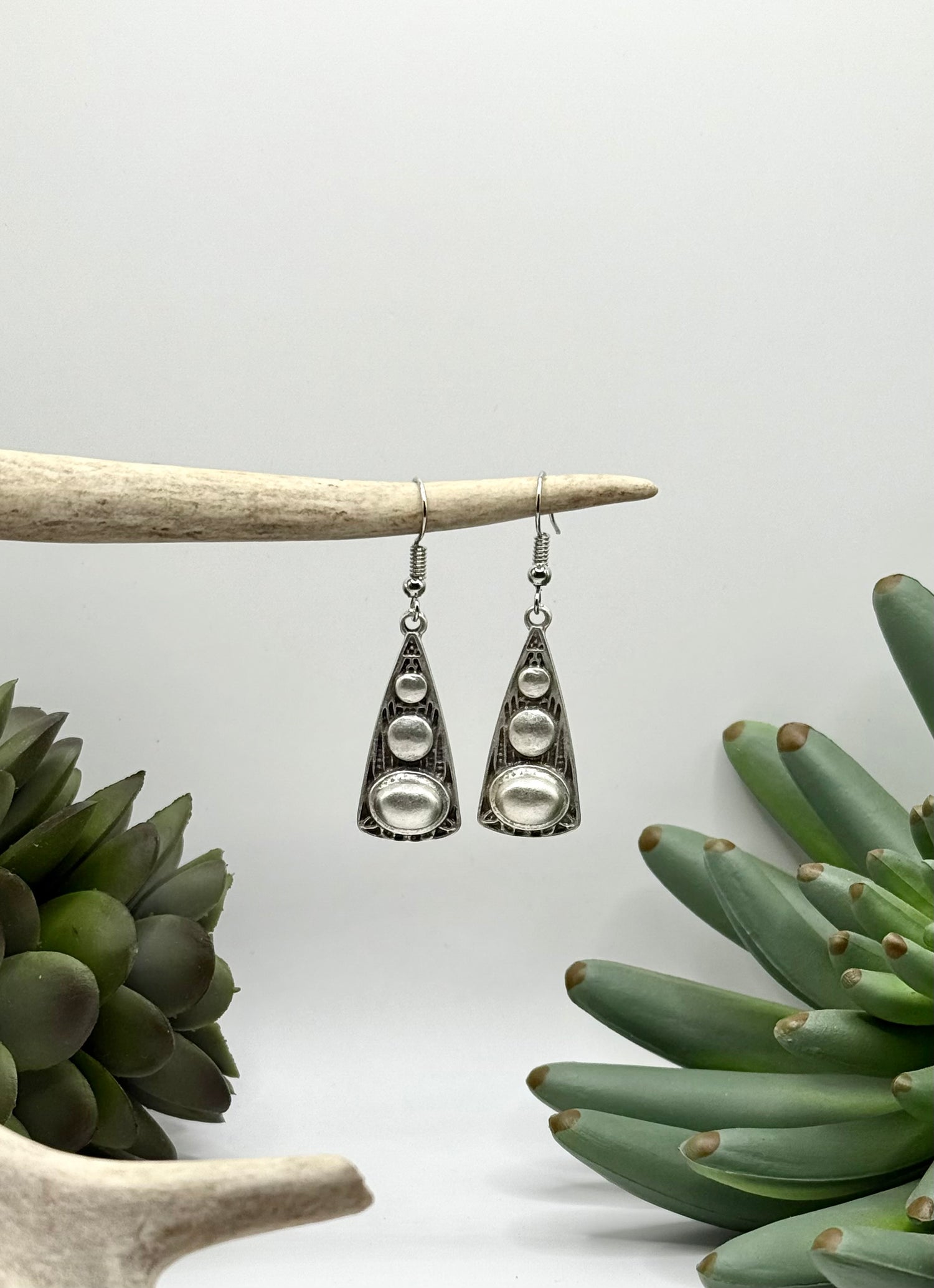 Add a modern touch with these silver earrings featuring a raised dot design in a unique triangle shape. .5” x 2” drop.