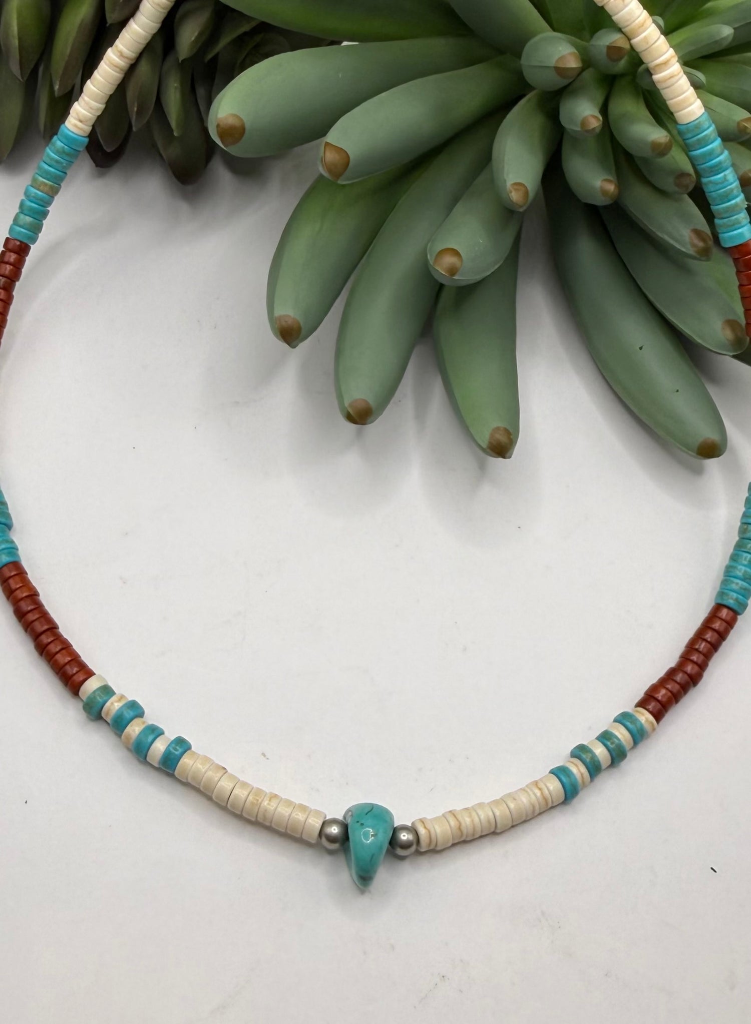 The Turquoise Nugget & Heishi Necklace showcases beautiful Heishi beads surrounding a striking turquoise nugget. With an adjustable length of 17” to 19”, it’s easy to customize for the perfect fit. This necklace adds a touch of Native American style to any outfit.