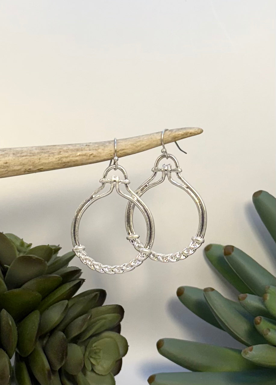 Matte hoop earrings with a twist design. Gold or silver. 1.25” round with 2” drop.