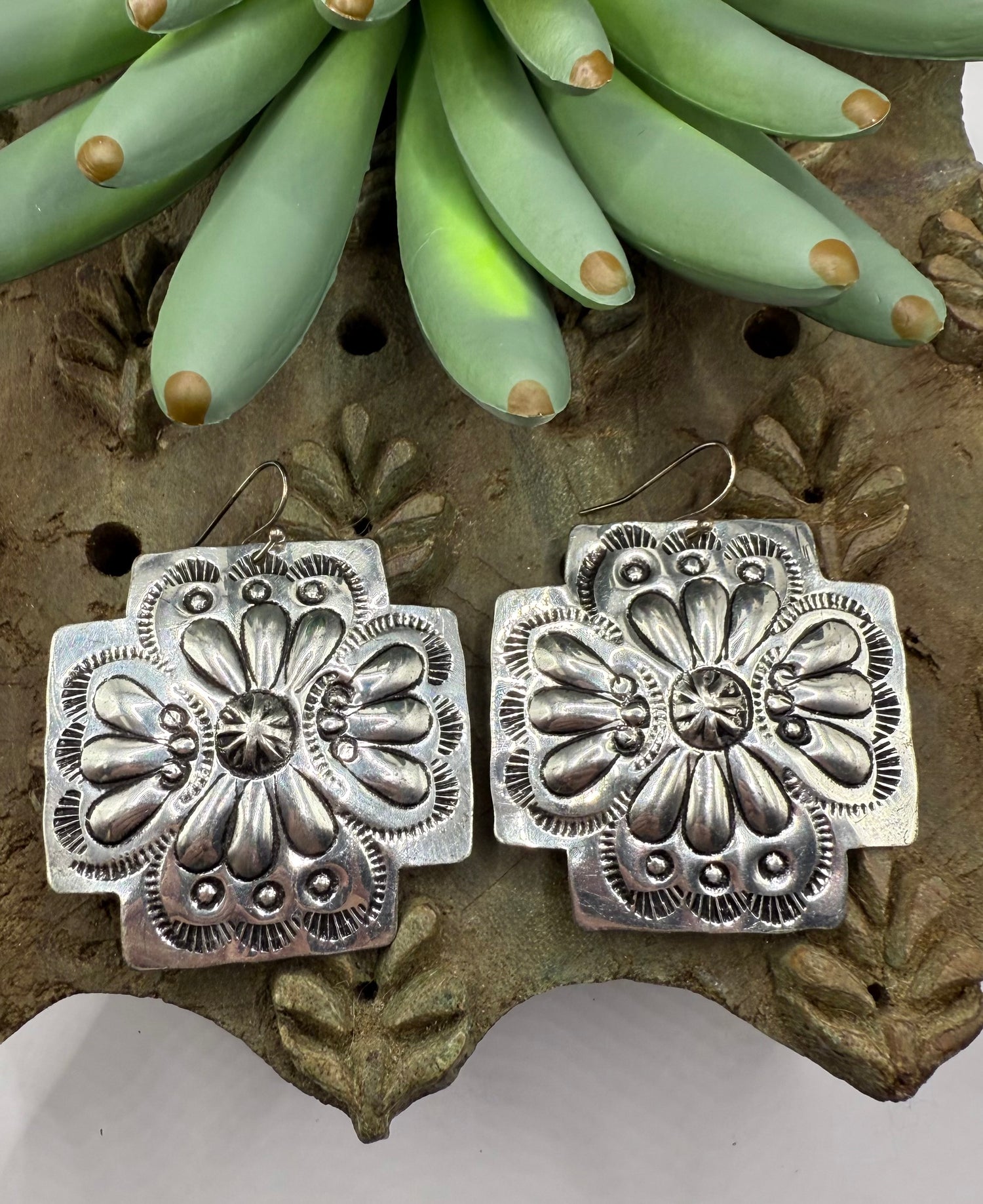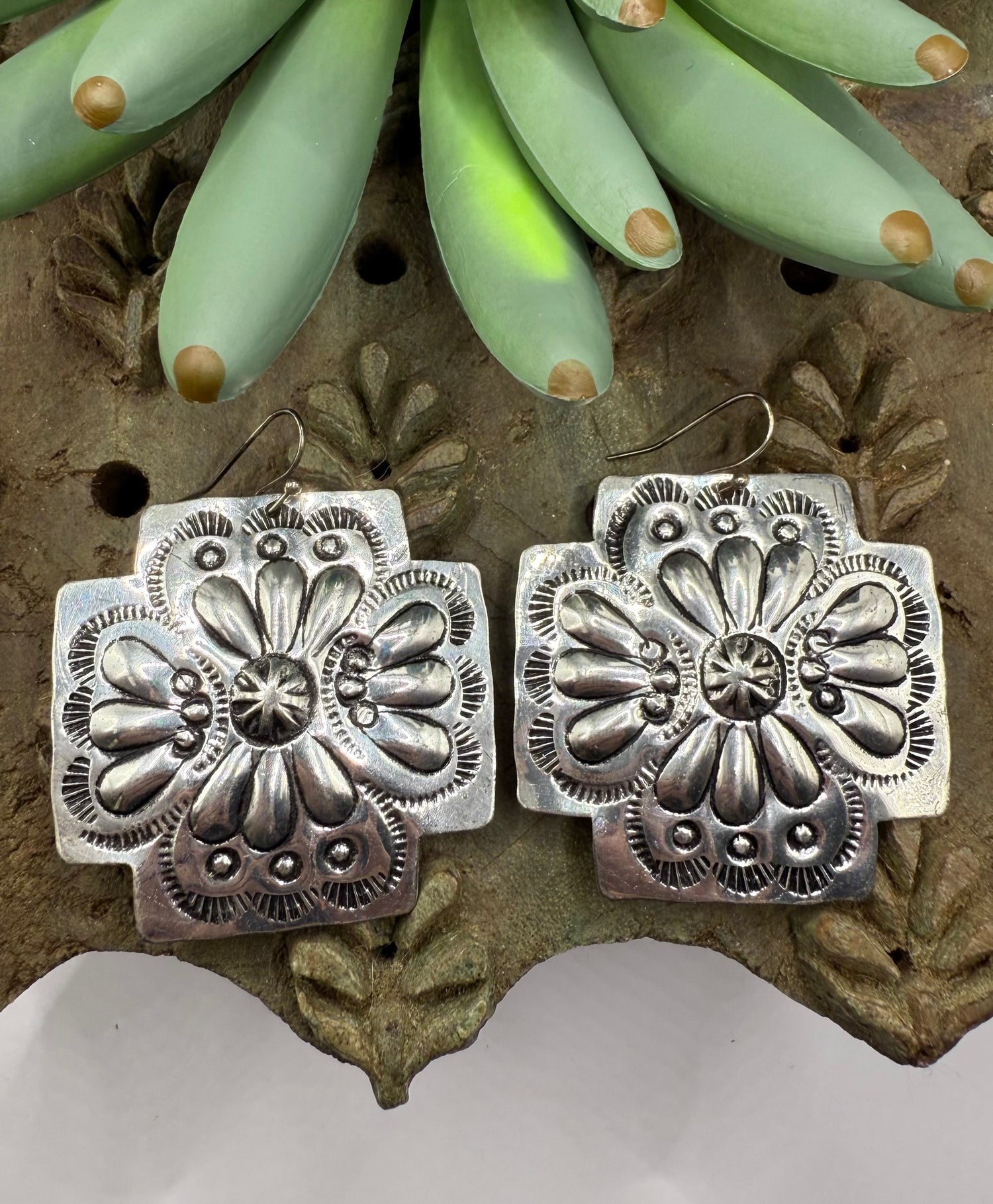 "These silver earrings feature a Western cross flower design and have a lightweight construction, measuring 1.75”x1.75” with a 2” drop."